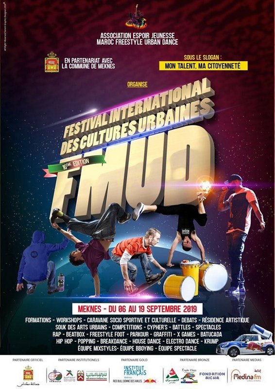 Sous l’égide de la Fédération Royale Marocaine des Sports Aérobics, Fitness, Hip Hop et disciplines assimilées ; l’Association Espoir Jeunesse Maroc Freestyle Urbain Danse organise, le 15ème Festival international des cultures urbaines (15ème FMUD 2019) à Meknès du 06 au 19 septembre 2019.