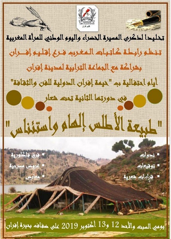 En célébration du 43ème anniversaire de la Marche Verte et de la journée nationale de la femme Marocaine, le Bureau local de la section d’Ifrane de la Ligue des Ecrivaines du Maroc organise ; la Deuxième édition de sa « Tente Internationale de l’Art et de la Culture d’Ifrane » et ce, le Samedi et Dimanche 12-13 octobre 2019 en cours sous le thème de : « La Nature de l’Atlas : Inspiration et Initiation ».