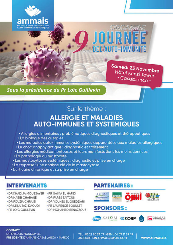 L’association marocaine des maladies auto-immunes et systémiques «AMMAIS» présidée par le Dr khadija Moussayer, organise la 9ème journée de l’auto-immunité, le samedi 23 novembre 2019 à l’hôtel Kenzi Tower de Casablanca, sous le thème de l’allergie et maladies auto-immunes et systémiques.