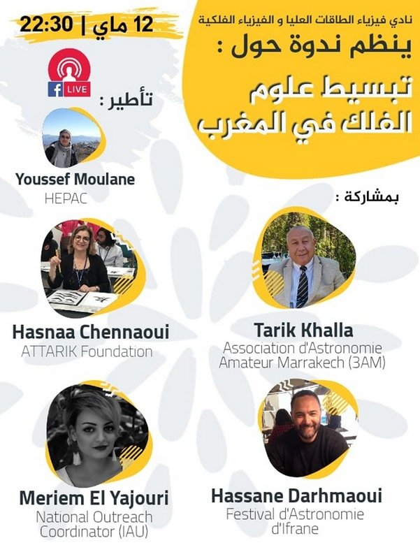 Dans le cadre de cette initiative « astr@tele-talk », le Club Marrakchi « High Energy and Astrophysics » organise Mardi 21 Mai 2020 à 22h30 prochain ; une visioconférence sur la thématique de : « la vulgarisation des sciences de l’astronomie au Maroc » animée par les éminents professeurs chercheurs : Hasna Chennaoui de la Fondation ATTARIK, Merièm El Yajouri du National Outrech Coodinator (IAU), Hassane Daghmaoui du Festival d’Astronomie d’Ifrane et Tarik Khalla de l’Association d’astronomie Amateur de Marrakech.