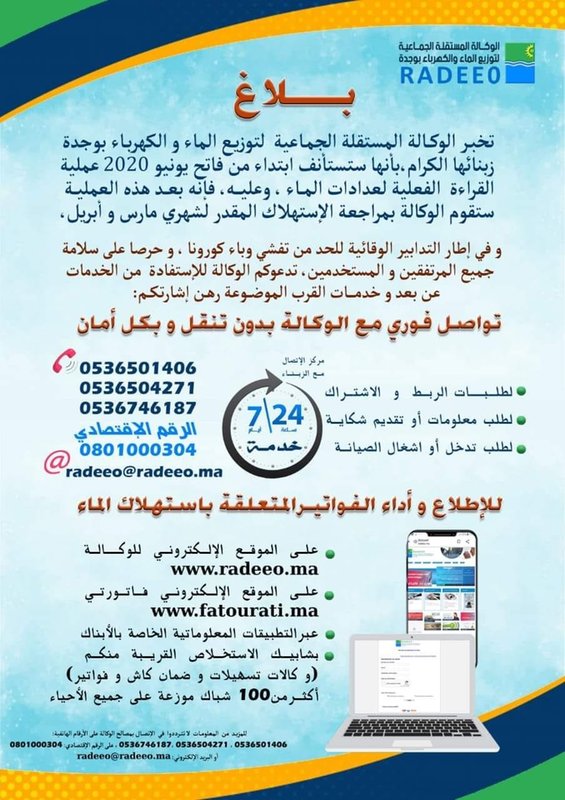 تخبر الوكالة الميتقلة الجماعية لتوزيع الماء والكهرباء بوجدة زبنائها الكرام ، بانها ستسأنف ابتداء من فاتح يونيو 2020 عملية القراءة الفعلية لعدادات الماء ، وعليه ، فانه بعد هذه العملية ستقوم الوكالة بمراجعة الاستهلاك المقدر لشهري مارس وأبريل
