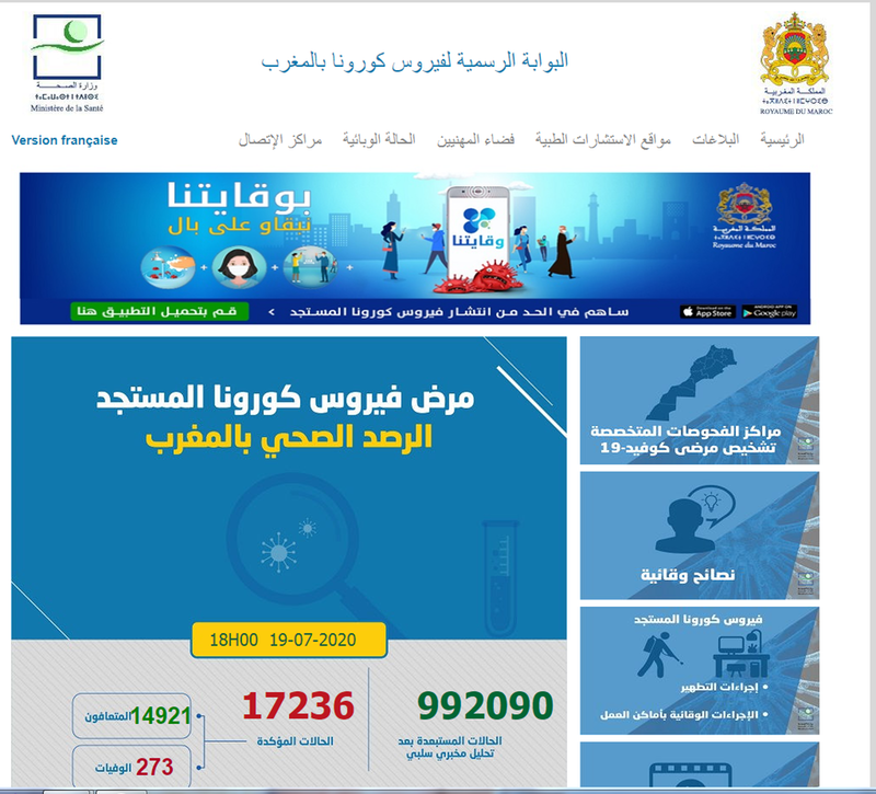 وأوضحت رئيسة مصلحة الأمراض الوبائية بمديرية علم الأوبئة ومكافحة الأمراض بالوزارة، السيدة هند الزين، في تصريح صحافي، أن الحصيلة الجديدة رفعت العدد الإجمالي لحالات الإصابة المؤكدة بالمملكة إلى 17 ألف و236 حالة منذ الإعلان عن أول حالة في 2 مارس الماضي، ومجموع حالات الشفاء التام إلى 14 ألف و921 حالة بنسبة تعاف بلغت 86,6 في المائة، فيما ارتفع عدد الوفيات إلى 273 حالة بمعدل إماتة ناهز 1,6 في المائة.