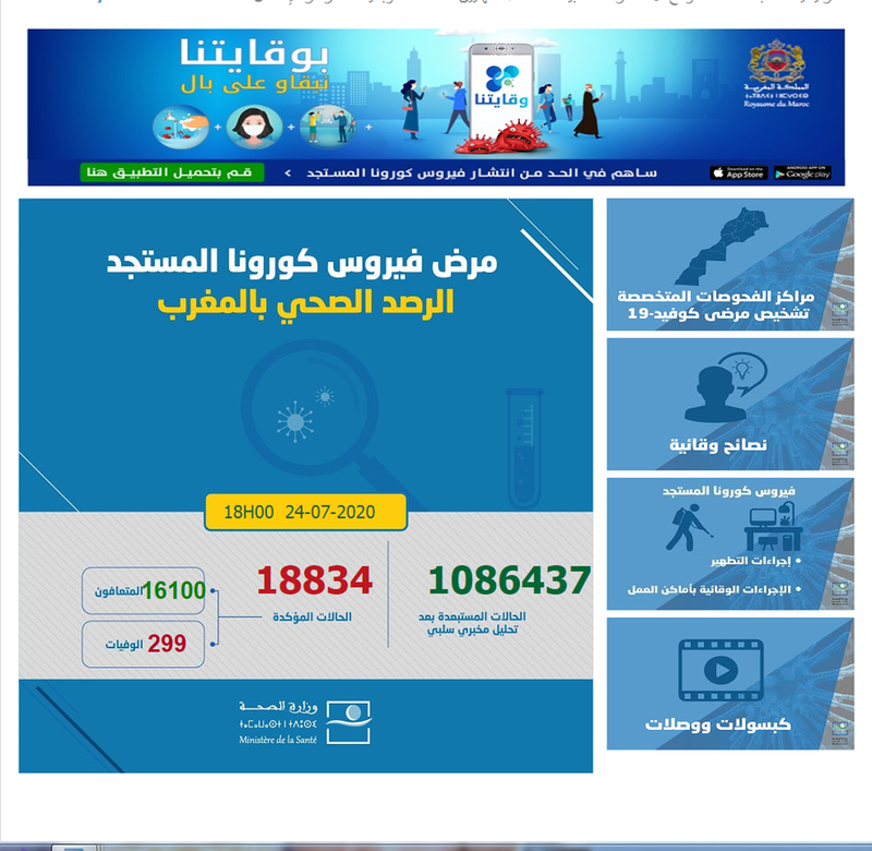 أعلنت وزارة الصحة، اليوم الجمعة، عن تسجيل 570 حالة إصابة جديدة بفيروس كورونا المستجد (كوفيد-19)، و228 حالة شفاء، وسبع حالات وفاة خلال الـ24 ساعة المنصرمة. وأوضح منسق المركز الوطني لعمليات طوارئ الصحة العامة بوزارة الصحة، السيد معاد لمرابط، في تصريح صحافي، أن الحصيلة الجديدة رفعت العدد الإجمالي لحالات الإصابة المؤكدة بالمملكة إلى 18 ألفا و834 حالة منذ الإعلان عن أول حالة في 2 مارس الماضي، ومجموع حالات الشفاء التام إلى 16 ألفا ومائة حالة بنسبة تعاف تناهز 5ر85 في المائة، فيما ارتفع عدد الوفيات إلى 299 حالة بمعدل إماتة بلغ 6ر1 في المائة.