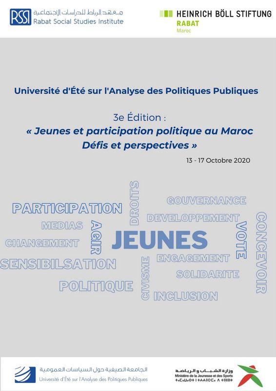 Le Rabat Social Studies Institute (RSSI) en partenariat avec la Fondation Heinrich Böll Rabat Maroc et le concours du Ministère de la Culture, de la Jeunesse et des Sports organise la 3ème édition de son université d’été sur l’analyse des politiques publiques sous le thème : « Jeunes et participation politique au Maroc : Défis et perspectives » et ce, du 13 au 17 octobre 2020 à Rabat.