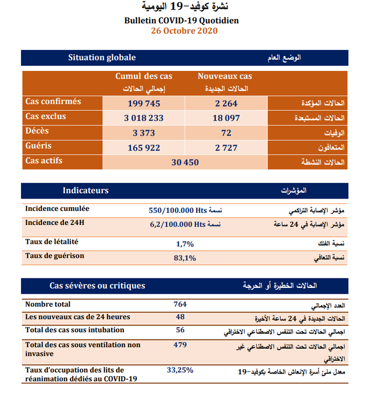 Le nouveau bilan porte à 199.745 le nombre total des contaminations depuis le premier cas signalé le 2 mars, et à 165.922 celui des personnes totalement rétablies, soit un taux de guérison de 83,1%, a précisé le ministère dans son bulletin quotidien de la Covid-19.
