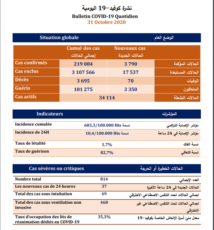 وبلغ عدد الحالات الخطيرة أو الحرجة الموجودة حاليا بأقسام الإنعاش والعناية المركزة، المسجلة خلال الـ24 ساعة الأخيرة 37 حالة، ليصل العدد الإجمالي لهذه الحالات إلى 814 حالة، 69 منها تحت التنفس الاصطناعي الاختراقي.