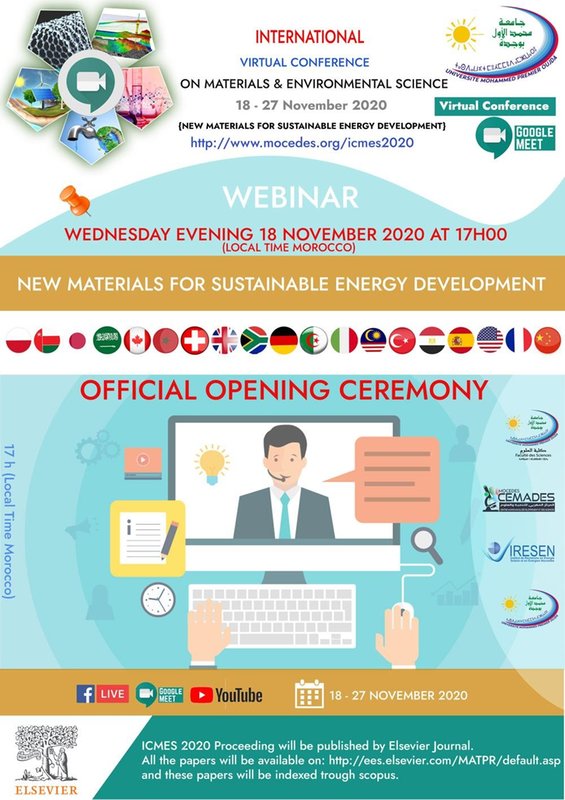 Home»Enseignement»4ème Conférence Internationale Virtuelle sur les Sciences des Matériaux et Environnement ICMES2020 : du 18 au 28 Novembre 2020