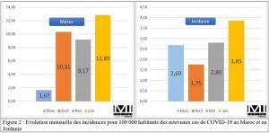 Figure 2 : Evolution mensuelle des incidences pour 100 000 habitants des nouveaux cas de COVID-19 au Maroc et en Jordanie