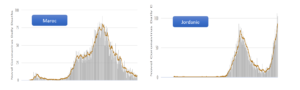 En Jordanie la variabilité est plus importante. En analysant la moyenne mobile sur 7 jours nous pouvons observer deux vagues bien distinctes. L’apogée de la première était vers la mi-novembre. Alors que l’actuelle vague continue son ascension (Figure 1).