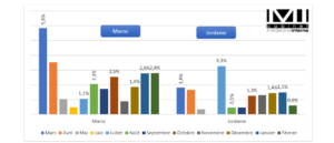 Les évolutions mensuelles des TL étaient globalement assez similaires. Mais avec tout fois une certaines baisses ces derniers mois en Jordanie comparativement au Maroc (Figure 5).