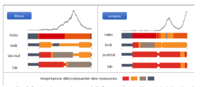 Pour faire face à la propagation des cas de la COVID-19 et à l’instar de plusieurs pays le Maroc et le Jordanie ont instauré des mesures préventives. Elles ont consisté notamment à fermer certains établissements tels que les écoles, les lieux de travail et les frontières internationales. La figure 8 montre les mesures mises en place lors de l’instauration des différents confinements au cours de l’épidémie au niveau des deux pays. Au niveau des frontières le Maroc a globalement été plus ferme. Alors que la Jordanie a été plus rigoureuse au niveau des lieux du travail et des écoles (Figure 8).