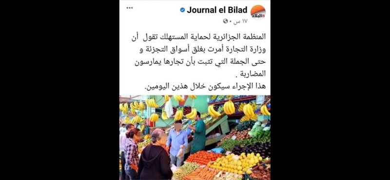 مرة أخرى في إطار تخصصها في السرقات والسطو والتزوير، قام موقع الجريدة الرسمية « البلاد » المقربة من النظام العسكري الجزائري بالسطو على صورة لمحل تجاري للخضر والفواكه المغربية، وذلك بهدف تسويق صورة إيجابية للجزائر إلى الشعب الجزائري على أنه محلّ تجاري جزائري يتوفر على القناطر المقنطرة من الفواكه والخضر المتنوعة وبوفرة كبيرة وأسعار في متناول الجميع تحيل على أن أسواق الجزائر لا ينقصها شيء ولا تشهد أزمة في المنتجات الغذائية، وكلّ ما يتم تداوله مجرد افتراء وبهتان وإذا كان هناك خصاص فبسبب احتكار وجشع عدد من الممونين، وعلقت على الصورة ب »المنظمة الجزائرية لحماية المستهلك أن وزارة التجارة أمرت بغلق أسواق التجزئة وحى الجملة التي تثبت بأن تجارها يمارسون المضاربة …
