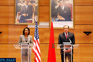 Rabat, 07/09/08- La Secrétaire d’Etat américaine, Mme. Condoleezza Rice, a réaffirmé dimanche à Rabat l’appui de son pays aux négociations sur le Sahara, estimant qu’il « existe de bonnes idées sur la table » et qu’il n’est par conséquent « pas besoin de recommencer à zéro », en allusion à l’initiative marocaine d’autonomie.