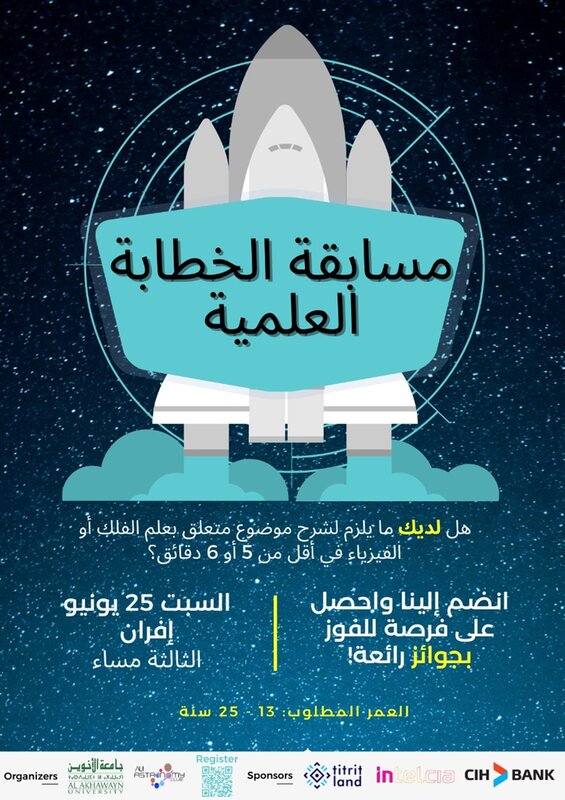 في إطار فعاليات مهرجان الفلك لإفران المقرر تنظيمه خلال الفترة الممتدة بين 22 و 26 من يونيو 2022، ينظم نادي الفلك بجامعة الأخوين بإفران مسابقة الخطابة العلمية و ذلك يوم السبت 25 يونيو المقبل بمدينة بإفران.