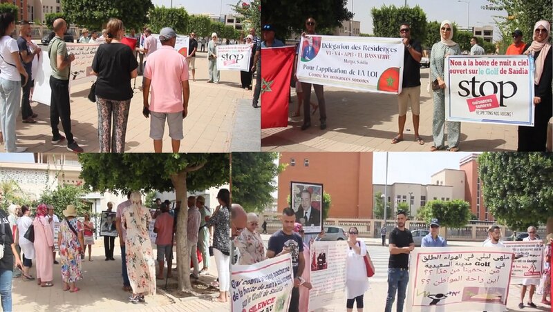 قاطنو الحي المتضررون رفعوا صورة الملك محمد السادس ولافتات كتب عليها شعارات تنديدية بالوضع الكارثي الذي غرقوا أو أُغرقوا فيه ومطالب برفع الضرر عنهم من قبيل  » مقهى ليلي في الهواء الطلق في Golf مدينة السعيدية. من يحمينا من هذا؟ أين راحة المواطن؟ » و »Non à la boite de nuit à ciel ouvert sur le golf de Saidia . Stop aux nuisances sonore. Respectons nos voisins ! » و »Délégation des résidences V3 – V4 – AP 13 El Bassatine Saidia. Pour l’aplication de la LOI contre les nuisances sonores ».