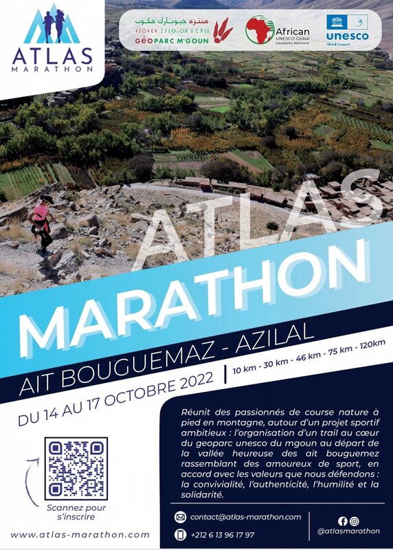 Initiée par la Coopérative et l’Association Vivante ; cette 1ère édition de l’Atlas Marathon de la vallée Heureuse Ait Bouguemez située en plein cœur du géo parc Unesco M’goun dans le Haut Atlas Centrale a pour objectif de découvrir aux coureurs nationaux et internationaux, la beauté du Royaume du Maroc à travers une expérience 100% nature,