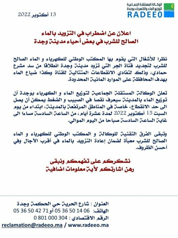 وجدة ـ هام ـ : اعلان عن اضطراب في التزود بالماء الصالح للشرب في بعض احياءالمدينة