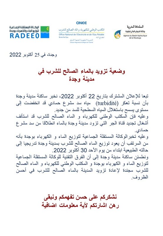 الوكالة المستقلة الجماعية لتوزيع الماء والكهرباء بوجدة : بلاغ حول وضعية تزويد ساكنة وجدة بالماء الصالح للشرب
