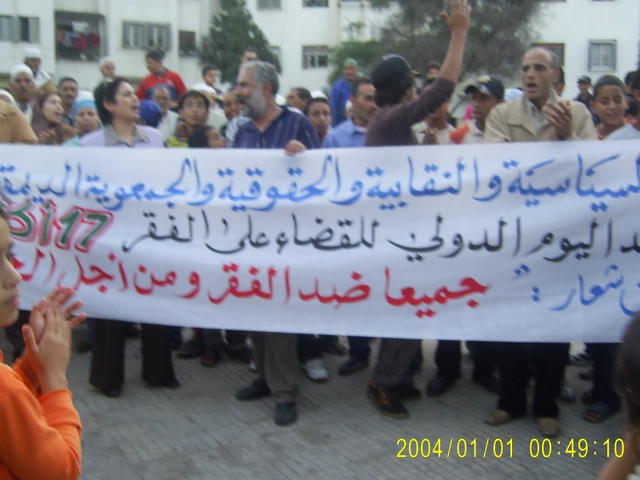 تخليدا لليوم الدولي للقضاء على الفقر،وأمام مقاطعة تابريكت بحي الرحمة ،وفي جو من الانضباط ،وتحت أعين الأجهزة الأمنية المرابطة هنا وهناك،نظمت الهيات السياسية والنقابية والجمعوية الديمقراطية واليسارية ،يوم الجمعة 17/01/08،وقفة احتجاجية تحت شعار « جميعا ضد العطالة والغلاء ومن اجل الحياة الكريمة « …