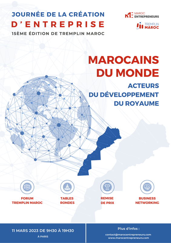 تنظم جمعية رواد الأعمال المغربية « Maroc Entrepreneurs » يوم السبت 11 مارس 2023 المقبل » يوم إنشاء المقاولة » بدار الكمياء بالعاصمة الفرنسية ؛ و ذلك بمناسب اختتام النسخة الخامسة عشر لبرنامجها « Tremplin Maroc ».لدعم خلق المقاولة