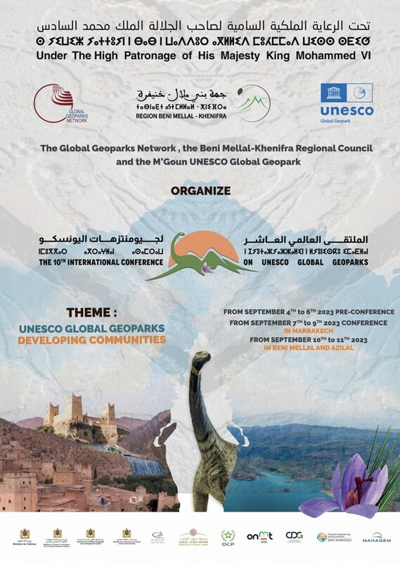 Sous le haut patronage de Sa Majesté le Roi Mohammed VI, le Réseau mondial des Géoparcs de l’UNESCO, le conseil régional de Beni Mellal-Khénifra et l’association Géoparc M’Goun et leurs partenaires organisent la 10ème édition de la conférence internationale sur les Géoparcs du 04 au 11 septembre 2023 prochain,