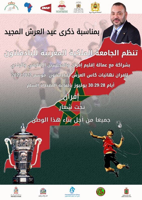 Le week-end du 28 au 30 juillet 2023, la salle couverte du complexe sportif d’Ifrane sera au rendez-vous avec l.organisation des finales de la Coupe du Trône de Badminton au titre de la saison 2022-2023.
