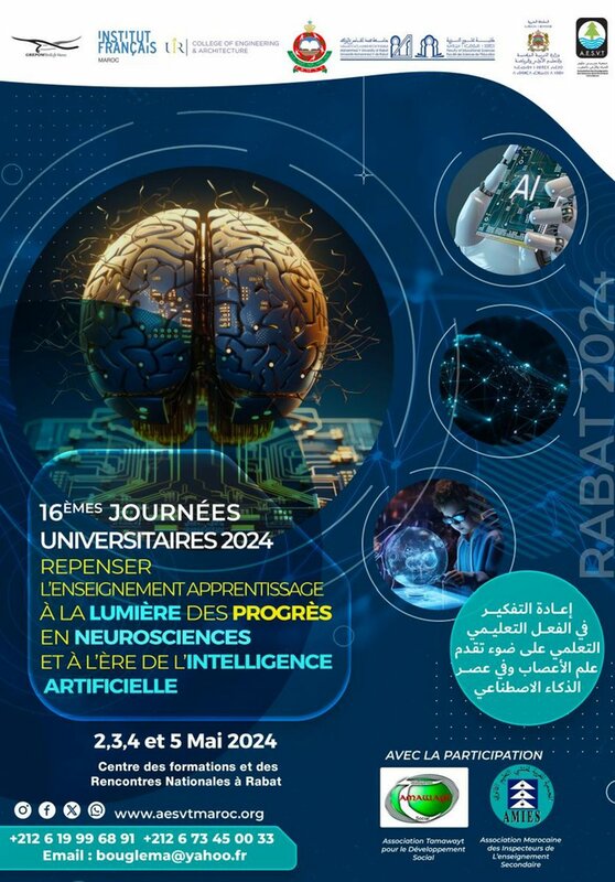 L’AESVT – Maroc et ses partenaires organisent la 16ème édition des Journées Universitaires de Rabat, du 02 au 04 mai 2024, sous le thème : « Repenser l’enseignement et l’apprentissage à la lumière des progrès en neurosciences et à l’ère de l’intelligence artificielle ».