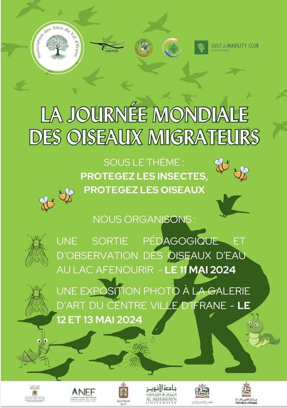En célébration de la Journée Mondiale des Oiseaux Migrateurs de l’an 2024 ; l’Association des Amis du Val d’Ifrane pour l’environnement et l’écotourisme, Donald School, Sust Inability Club, GREPOM/BirdLife Maroc et le Parc National d’Ifrane Coorganisent une Sortie Pédagogique et d’observation des oiseaux d’eau au Lac d’Aguelmam Afenourir classé Site Ramsar et une petite randonnée à la découverte des Dolines de la Région et ce ; Le samedi 11 mai 2024 au profit d’un groupe de jeunes élèves et étudiants des établissements partenaires.