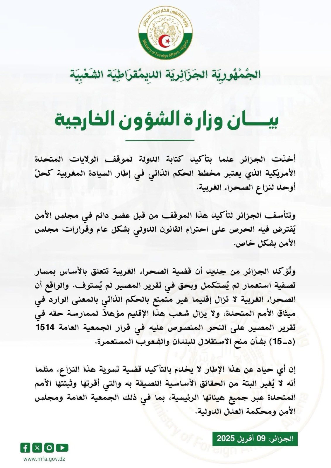Home»في بياني ردوده على اعترافهما بمغربية الصحراء: نظام الجزائر يتأدب مع أمريكا خلافا مع فرنسا التي أغضبها لكن أعادته إلى حجمه»algerie_communiquee_usaalgerie_communiquee_usa2025-04-10/ 10/04/2025/0/ 270SharesFacebookTwitterPinterestGoogle+ Loading...Dans le même sujetفي نفس الموضوع