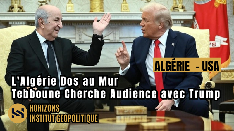 نشر موقع « معهد آفاق الجيوبوليتيكا » في  19 أبريل 2025  بقلم الصحفي عبد الحكيم يماني، مقالا عن الجزائر ومسعى رئيسها عبدالمجيد تبون إلى الظفر بلقاء رئيس الولايات المتحدة الأمريكية « دونالد ترامب » بعد فشل عدد من المحاولات للتقرب من الإدارة الأمريكية بإغراءات لا حدود لها بل « حدودها السماء » بتعبير « صبري بوقادوم » سفير الجزائر في واشنطن.