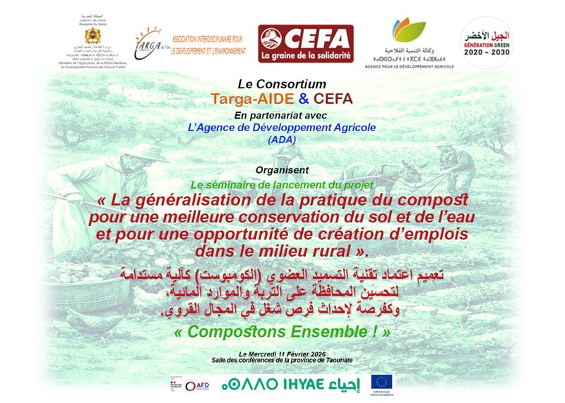Taounate, Maroc – Le Consortium Targa-AIDE & CEFA, en partenariat avec l’Agence de Développement Agricole (ADA), a lancé officiellement le projet « Compostons Ensemble » visant à promouvoir la pratique du compostage pour une meilleure conservation du sol et de l’eau, ainsi que pour créer des opportunités d’emploi dans le milieu rural.