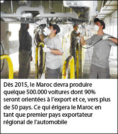 Dès 2015, le Maroc devra produire quelque 500.000 voitures dont 90% seront orientées à l’export et ce, vers plus de 50 pays. Ce qui érigera le Maroc en tant que premier pays exportateur régional de l’automobile.
