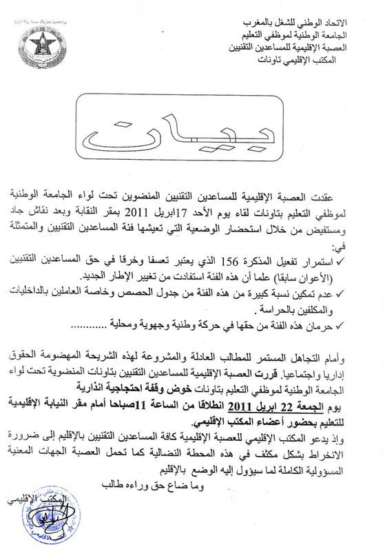 دعت العصبة الإقليمية للمساعدين التقنيين بتاونات (الأعوان سابقا) المنضوية تحت لواء الجامعة الوطنية لموظفي التعليم(أ.و.ش.م) في بيان (توصلت بنسخة منه) خوض وقفة احتجاجية إنذارية وذلك يوم الجمعة 22 ابريل 2011 انطلاقا من الساعة 11صباحا أمام مقر النيابة الإقليمية للتعليم بحضور أعضاء المكتب الإقليمي. وجاء هذا القرار بعد بعد نقاش جاد ومستفيض استحضارا للوضعية التي تعيشها هذه الفئة في لقاء عقد بمقر النقابة يوم الأحد 17ابريل 2011، تتمثل الوضعية في استمرار تفعيل المذكرة 156 الذي اعتبرتها العصبة في بيانها تعسفا وخرقا في حق المساعدين التقنيين (الأعوان سابقا) علما أن هذه الفئة استفادت من تغيير الإطار الجديد. وعدم تمكين نسبة كبيرة من هذه الفئة من جدول الحصص وخاصة العاملين بالداخليات والمكلفين بالحراسة، وحرمانها أيضا من حقها في حركة وطنية وجهوية ومحلية أسوة بباقي الفئات، وجاء هذا القرار –الوقفة الانذارية- أمام التجاهل المستمر للمطالب العادلة والمشروعة لهذه الشريحة المهضومة الحقوق إداريا واجتماعيا. كما دعت العصبة في بيانها كافة المساعدين التقنيين بالإقليم إلى ضرورة الانخراط بشكل مكثف في هذه المحطة النضالية، محملة الجهات المعنية المسؤولية الكاملة لما سيؤول إليه الوضع بالإقليم.