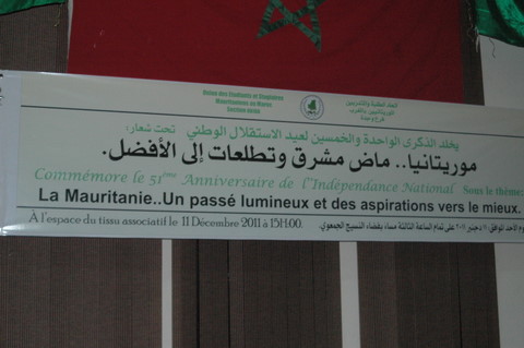 En commémoration au 51ème Anniversaire de l’Indépendance de la Mauritanie, les étudiants Mauritaniens « l’Union des Etudiants et Stagiaires Mauritaniens Section Oujda » de l’Université Mohammed Ier ont célébré cet événement par une journée culturelle qui a eu lieu 11-12-2011 au « complexe du tissu associatif de la ville d’Oujda ».