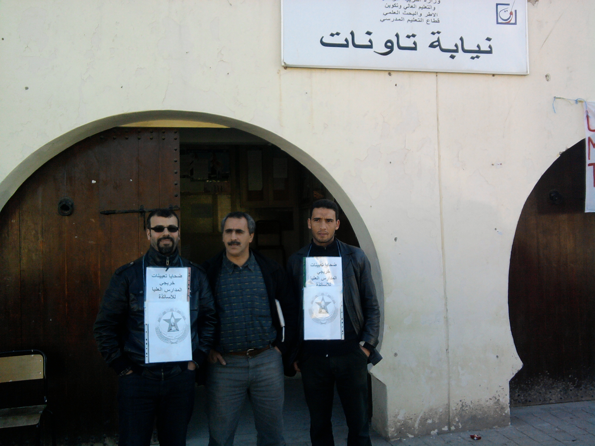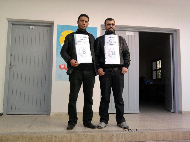 قرر الاستاذين محمد حكازي (مادة فرنسية) وحماد وهاب( مادة اجتماعيات) العاملين بالثانوية التاهيلية خالد بن الوليد بنيابة تاونات خوض اشكال نضالية اولية ابتدأها بالتوقف عن العمل يوم الخميس 29/12/2011 من الساعة الثالثة الى الساعة الرابعة مساء. وجاء هذا القرار حسب بيان المكتب الجهوي للجامعة الوطنية لموظفي التعليم بجهة تازة الحسيمة تاونات كرسيف (ا.و.ش.م) -توصلت بنسخة منه- بعد تسجيل تماطل الاكاديمية الجهوية للتربية والتكوين بجهة تازة الحسيمة تاونات كرسيف في ايجاد حل عادل ومنصف والمتجلي في تصحيح وضعية التعيين للاستاذين بنيابات عمل ازواجهم التين تعملن بكل من نيابة تازة ونيابة كرسيف عوض نيابة تاونات مقر التعيين، وطالب المكتب الجهوي تصحيح وضعيتهم على غرار ملفات مماثلة استفادت من قبل من تصحيح الوضعية والانتقال الى مقر عمل زوجاتهم. وتأتي هذه الخطوة التصعيدية للاستاذين حسب البيان بعد مجموعة من الخطوات التفاوضية التي نهجها المكتب الجهوي (طعن في نتائج التعيينات- تقديم طلبات تصحيح الوضعية لثلاث مرات، اضافة الى تقديم طلبات الانتقال لمرتين مرفوقة بالوثائق التبريرية) وبعد استنفاذ كافة الوسائل، ومن المقرر ان يعتصما الاستاذين لمدة يوم واحد بمقر النيابة الاقليمية بتاونات، وذلك يوم الجمعة30/12/2011 واعتبر المكتب الجهوي ان هذه الاشكال النضالية للاستاذين كخطوة اولى للتعبير عن رفض سياسة الكيل بمكيالين من طرف النيابة الاقليمية لتاونات والاكاديمية الجهوية، تليها خطوات اخرى (حسب البيان) اكثر تصعيدا على المستوى الجهوي والمركزي سيتم الاعلان عنها في بيان آخر.