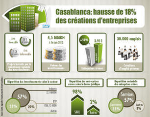 Le Centre régional d’investissement (CRI) du Grand Casablanca a enregistré, durant le premier semestre 2012, un record de création d’entreprises avec 3.911 entreprises, soit une hausse de plus de18 pc par rapport à la même période de l’année précédente.
