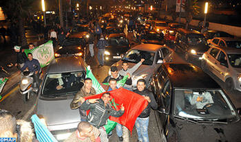 فبعدما تتبع الجمهور المغربي بشغف كبير وبكل جوارحهم وعواطفهم هذه المباراة التي كسبها الفريق المغربي نتيجة وأداء، خرجت حشود غفيرة إلى العديد من الشوارع مباشرة بعد نهاية اللقاء للتعبير عن فرحتها حاملة الأعلام الوطنية ومرددة شعارات تمجد هذا الإنجاز الرائع الذي طالما انتظروه.