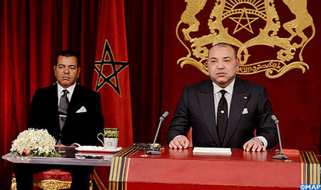 Ainsi, nous continuons tous à porter le flambeau de la Révolution renouvelée du Roi et du peuple, forts d’une symbiose indissoluble entre les composantes de la Nation, et constamment fidèles à la mémoire immaculée de Son Glorieux Héros, Notre Grand-Père, feu Sa Majesté le Roi Mohammed V et de son compagnon de lutte, Notre illustre Père,  feu Sa Majesté le Roi Hassan II, que Dieu les ait en Sa sainte miséricorde, et au souvenir des valeureux martyrs de la Résistance et de la Libération.