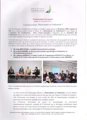 L’Ecole Nationale d’Architecture de Rabat a accueilli, comme prévu, le 10 Janvier 2015 à partir de 15h, une conférence/débat traitant le thème de « Particularité ou Uniformité ? » sous l’égide de « Carrefour des Civilisations – Pour s’entre-connaître ». Rappelons que le Carrefour des Civilisations aspire à la rencontre et la convergence des sphères civilisationnelles de par son ouverture sur les autres peuples et le partage des valeurs et sagesses avec elles.