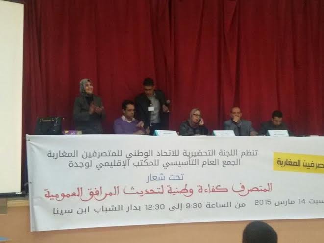 انعقد بمقر دار الشباب ابن سينا الجمع العام التاسيسي للمكتب الإقليمي للمتصرفين بوجدة تحت إشراف رئيسة الإتحاد الوطني للمتصرفين المغاربة و كذا المكتب الجهويي للمتصرفين بالجهة الشرقية،و بحضور مشرف لأكثر من ثمانين متصرفا يمثلون أحد عشرة قطاعا،بالإضافة لبعض القيادات السياسية و النقابية بالمدينة،تم انتخاب أعضاء المكتب الإقليمي و هم كالتالي: