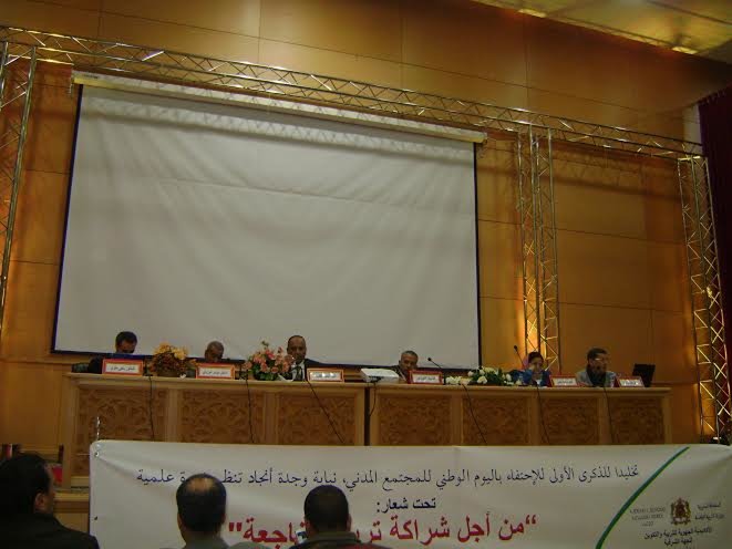 تنفيذا للتعليمات السامية لصاحب الجلالة الملك محمد السادس نصره الله والقاضية بجعل يوم 13 مارس من كل سنة يوما وطنيا للمجتمع المدني ، نظمت النيابة الإقليمية لوزارة التربية الوطنية والتكوين المهني بوجدة انجاد ندوة علمية تحت شعار « من أجل شراكة تربوية ناجعة » ترأسها كل من السيد الحبيب شوباني الوزير المكلف بالعلاقات مع البرلمان والمجتمع المدني و السيد التهامي موسي النائب الإقليمي لوزارة التربية الوطنية والتكوين المهني بوجدة يوم الجمعة 20 مارس 2015 بمركز الدراسات والبحوث الإنسانية والاجتماعية بوجدة.