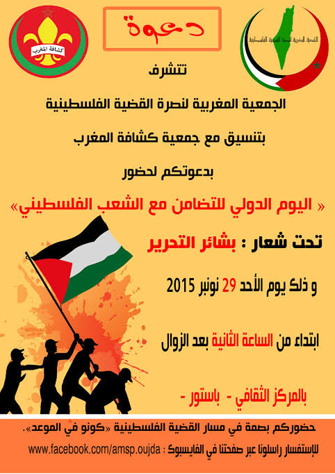 تنظم الجمعية المغربية لنصرة القضية الفلسطينية بتنسيق مع جمعية كشافة المغرب اليوم الدولي التضامني مع الشعب الفلسطيني