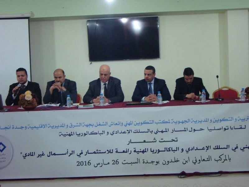 نظم لقاء حول إرساء المسالك المهنية يوم 26 مارس 2016 وذلك بمقر ابن خلدون للأنشطة التربوية في شراكة بين الأكاديمية الجهوية للتربية والتكوين لجهة الشرق والمديرية الإقليمية لوجدة أنجاد ومكتب التكوين المهني وإنعاش الشغل بالجهة الشرقية.وقام بتنشيطه السيد ادريس بوغرارة رئيس مصلحة الشؤون التربوية بالمديرية .