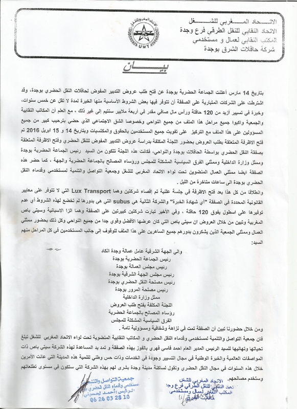 بتاريخ 14 مارس أعلنت الجماعة الحضرية بوجدة عن فتح طلب عروض التدبير المفوض لحافلات النقل الحضري بوجدة، وقد اشترطت على الشركات المتبارية على الصفقة أن تتوفر فيها بعض الشروط الأساسية منها لمدة الخبرة لمدة لا تقال عن خمس سنوات، وخبرة في تسيير أزيد من 120حافلة ورأس مال صافي مدر في أربعة ملايير سنتيم إلى غير ذلك، مع العلم أن المكاتب النقابية والجمعية واكبوا جميع مراحل هذا الملف من جميع النواحي وخصوصا الشق الاجتماعي الذي حضي بترحيب كبير من جميع المسؤولين على هذا الملف مع التركيز على تفويت جميع المستخدمين بالحقوق والمكتسبات وبتاريخ 14 و 15 أبريل 2016 تم فتح الاظرفة المتعلقة بطلب العروض بحضور اللجنة المكلفة بدارسة عروض التدبير المفوض للنقل الحضري وفتح الاظرفة المتعلقة بصفقة النقل الحضري بواسطة الحافلات بوجدة والنواحي، فكانت هذه اللجنة تتكون من السيد رئيس الجماعة الحضرية بوجدة وممثل وزارة الداخلية وممثلي الفرق السياسية المشكلة للمجلس ورؤساء المصالح بالجماعة الحضرية والجهة، كما حضر هذه الصفقة أيضا ممثلي العمال المنضوين تحت لواء الاتحاد المغربي للشغل وجمعية التواصل والتنمية لمستخدمي وقدماء النقل الحضري بوجدة إلى ساعات متأخرة من الليل.