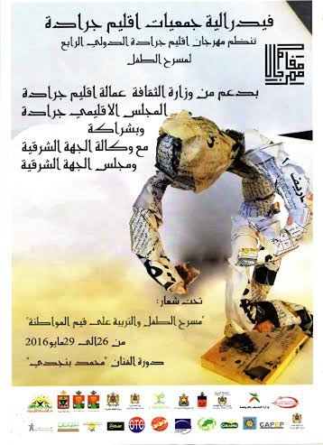 تنظم فيدرالية جمعيات اقليم جرادة « مهرجان مفاحم » الدولي الرابع لمسرح الطفل تحت شعار »مسرح الطفل والتربية على قيم المواطنة » أيام 26-27-28-29مايو2016بالمركز الثقافي بجرادة وستشارك في المهرجان فرق دولية :