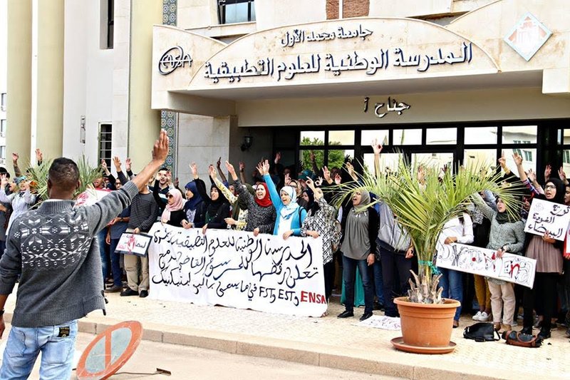 Les étudiants ENSAOistes continuent toujours leurs manifestations et leur rage contre le décret imposé de la fusion tout en clôturant presque un mois de boycott demain le Mercredi 19 octobre 2016. Aujourd’hui le Mardi 18 octobre 2016 une manifestation silencieuse s’est tenue devant le bloc A administratif de l’Ecole Nationale des Sciences Appliquées d’OUJDA tout en bloquant l’accès des fonctionnaires de l’administration de l’école à leur bureaux afin de pratiquer leur travail quotidien. Cette dernière a duré une matinée de 8h à 12h et personne n’avait l’accès au bloc. Ceci n’est que le début afin de presser sur l’administration et la présidence de l’université de bien transmettre notre demande de retrait des ENSA de l’école polytechnique au ministère. Presque un mois est passé et les ENSAistes restent toujours privés de leur droit de continuer leurs études dans l’école choisie et MÉRITÉE, sans aucune réponse et avec une indifférence et insouciance !! #ENOUGH-IS-ENOUGH