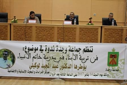 في سابقة من نوعها، نظمت مصلحة الشؤون الثقافية بجماعة وجدة ندوة علمية في موضوع: تربية الأبناء في مدرسة خاتم الأنبياء بمركز الدراسات والبحوث الإنسانية والاجتماعية، وذلك يومه السبت 14 يناير 2017، أطرها البروفيسور والإعلامي عبد المجيد لوكيلي في حضرة رئيس الجماعة الدكتور عمر حجيرة الذي سلمت له الكلمة أولا ليعبر فيها عن نقط التماس و يرفع اللبس الذي قد يستشكل على العديد من المحاضرين من خلال تساؤلاتهم وربما حتى استغرابهم كيف لمجلس بلدي من مهامه السهر على تسيير شؤون المدينة من إنارة ونظافة ونقل وحدائق وطرقات وغيرها أن يفكر في تنظيم ندوة حول تربية الأبناء.