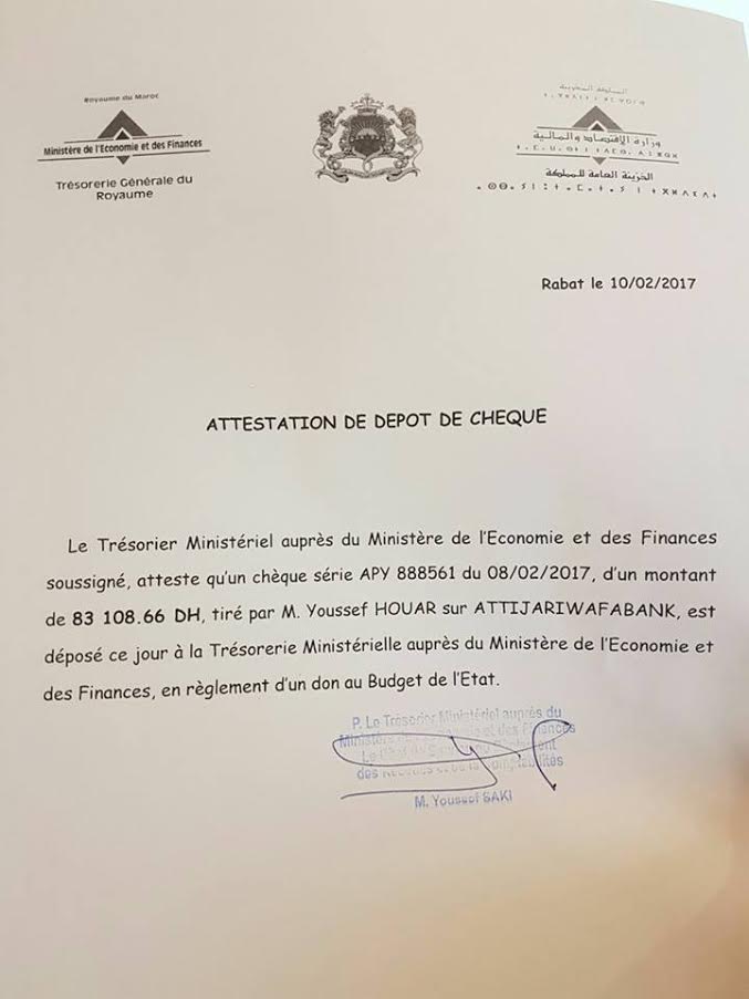 والصورة المرافقة هي حجة تنازل عضو مجلس النواب يوسف هوار عن مرتبه « غير المستحق » الذي تسلمه يوم الأربعاء 08 فبراير الجاري وأرجعه للخزينة العامة يوم الجمعة 10 فبراير .