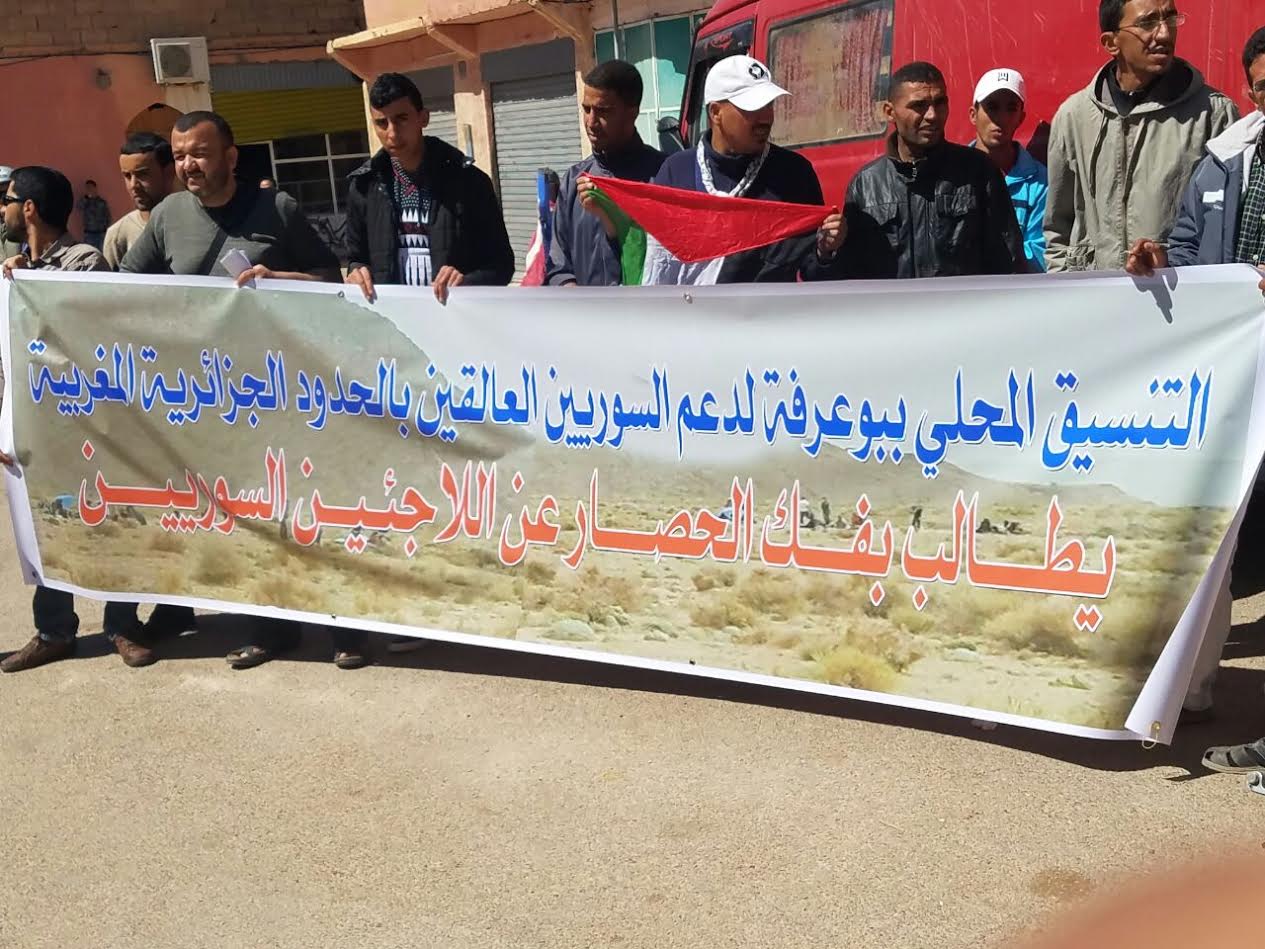 يتابع الرأي العام المحلي و الاقليمي و الوطني بقلق شديد ما يتعرض له الاخوة السورين العالقين بالحدود المغربية الجزائرية – ضواحي فجيج – من حصار غيبت فيه كل الشروط الانسانية المكفولة للاجئين حسب ما تنص عليه المواثيق و المعاهدات الدولية ، واعتبارا لما تقتضيه الضرورة الاخلاقيـــــــة و الانسانية من استعجال يتناسب و رفع الحصار الفوري على اللاجئين العالقين، و انضباطا للتوصيات التي انبثقت عن اللقاء التشاوري المنعقد يومه الجمعة 28 ابريل الجاري بمقر الكونفدرالية الديمقراطية للشغل ، بحضور جل الهيئات السياسية و النقابية و الجمعوية ، التي تؤثث مشهد المجتمع المدني المحلي ، و الذي توج بميلاد » التنسيق المحلي لدعم السورين العالقين بالحدود المغربية الجزائرية – ضواحي فجيج – » .