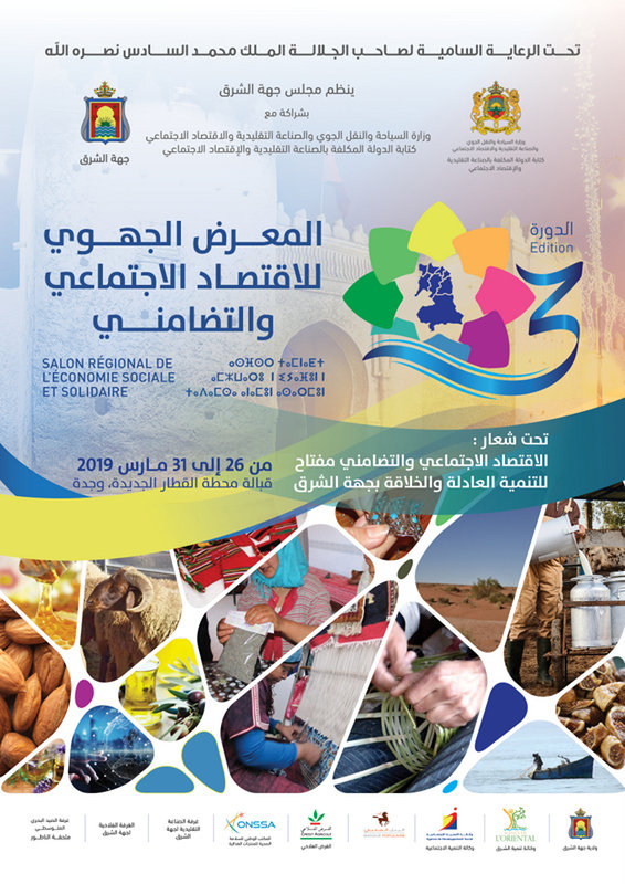 تحت الرعاية السامية لصاحب الجلالة الملك محمد السادس نصره الله، ينظم مجلس جهة الشرق بشراكة مع وزارة السياحة والنقل الجوي والصناعة التقليدية والاقتصاد الاجتماعي – كتابة الدولة المكلفة بالصناعة التقليدية والاقتصاد الاجتماعي، وبتعاون مع ولاية جهة الشرق « ينظم » الدورة الثالثة للمعرض الجهوي للاقتصاد الاجتماعي والتضامني تحث شعار «الاقتصاد الاجتماعي والتضامني مفتاح للتنمية العادلة والخلاقة بجهة الشرق » وذلك من 26 إلى31 مارس 2019 قبالة محطة القطار الجديدة بوجدة.
